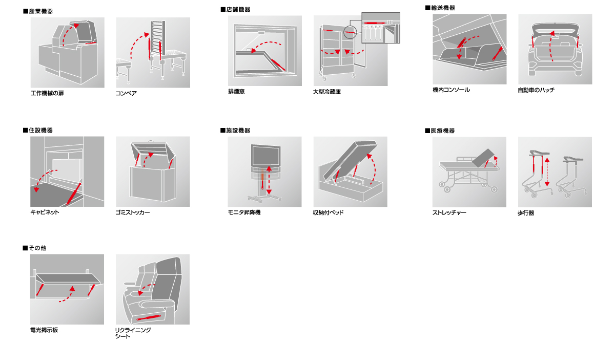 ガススプリングは、産業機器や輸送機器、店舗機器や住設機器など、あらゆる場面で使用されています。