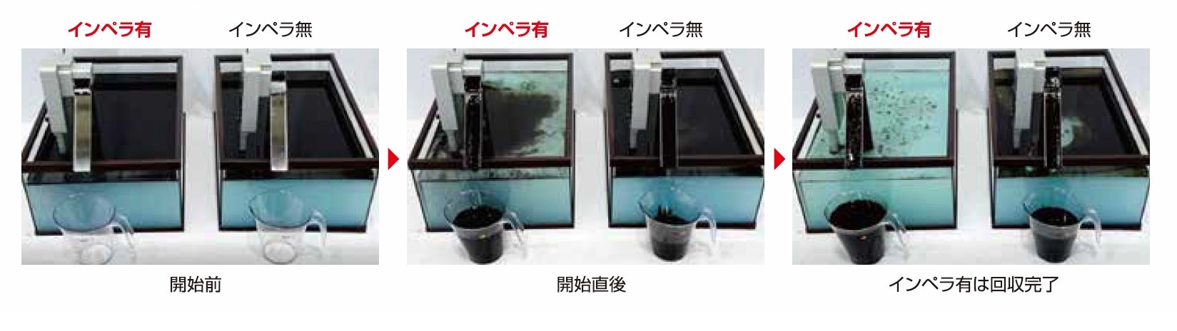 付属のインペラで対流を発生させるので、浮上油が引き寄せられ、回収スピードが早い!
